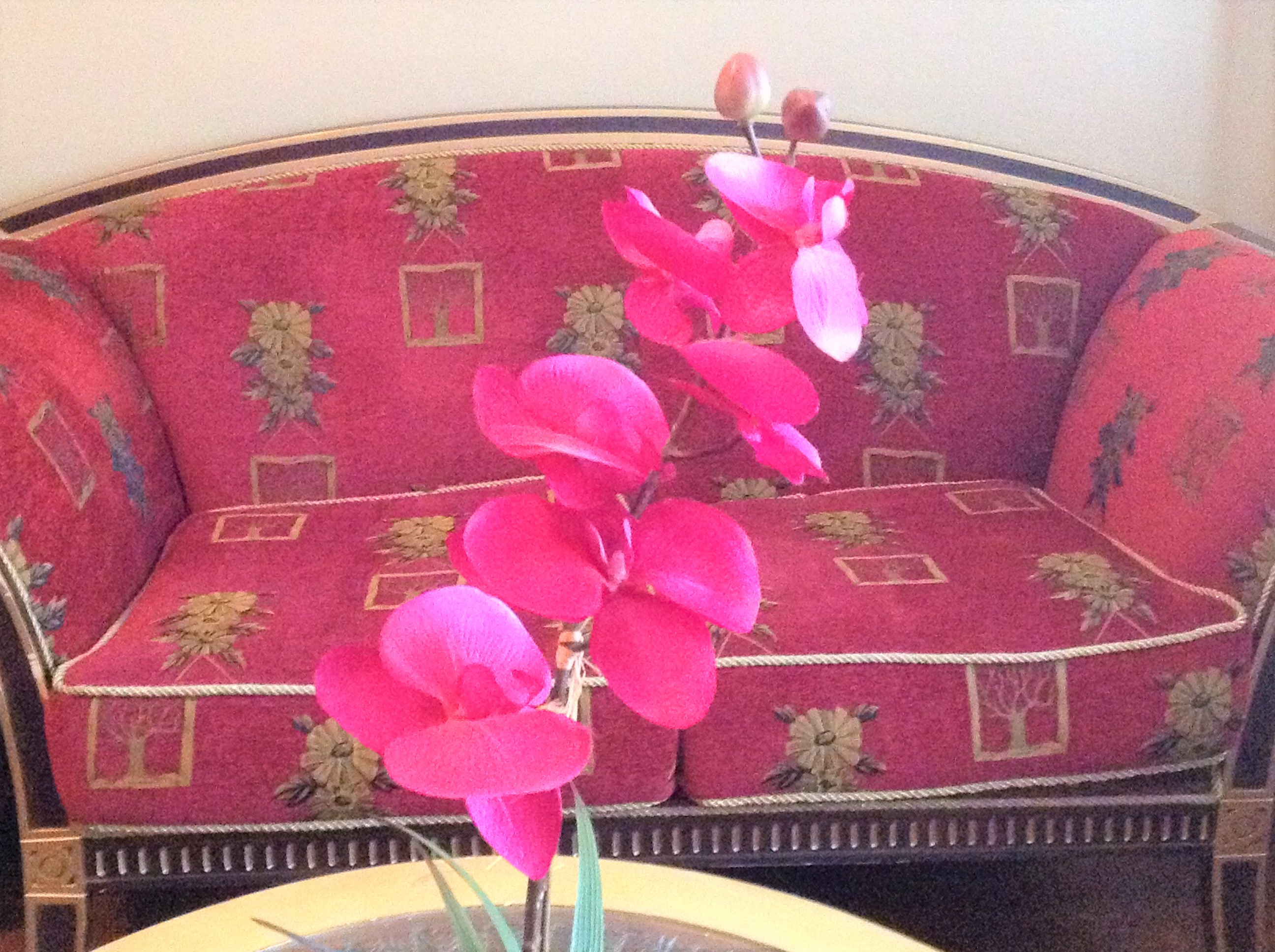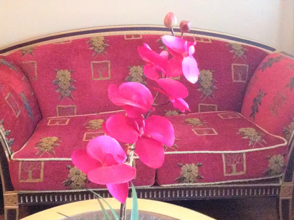 Victoria Historic Bedroom, Light Pastel and White Bedding High Cotton Count. High Ceiling Hardwood Flooring. High Designer Style Suite with 6 ft Settee, & Love Seat Camel Back. Tow Desk. Flat screen TV, Ample Seating Separate Kitchenette, Private Shower. Semi Upscale. Exterior Suite SImple Deco .