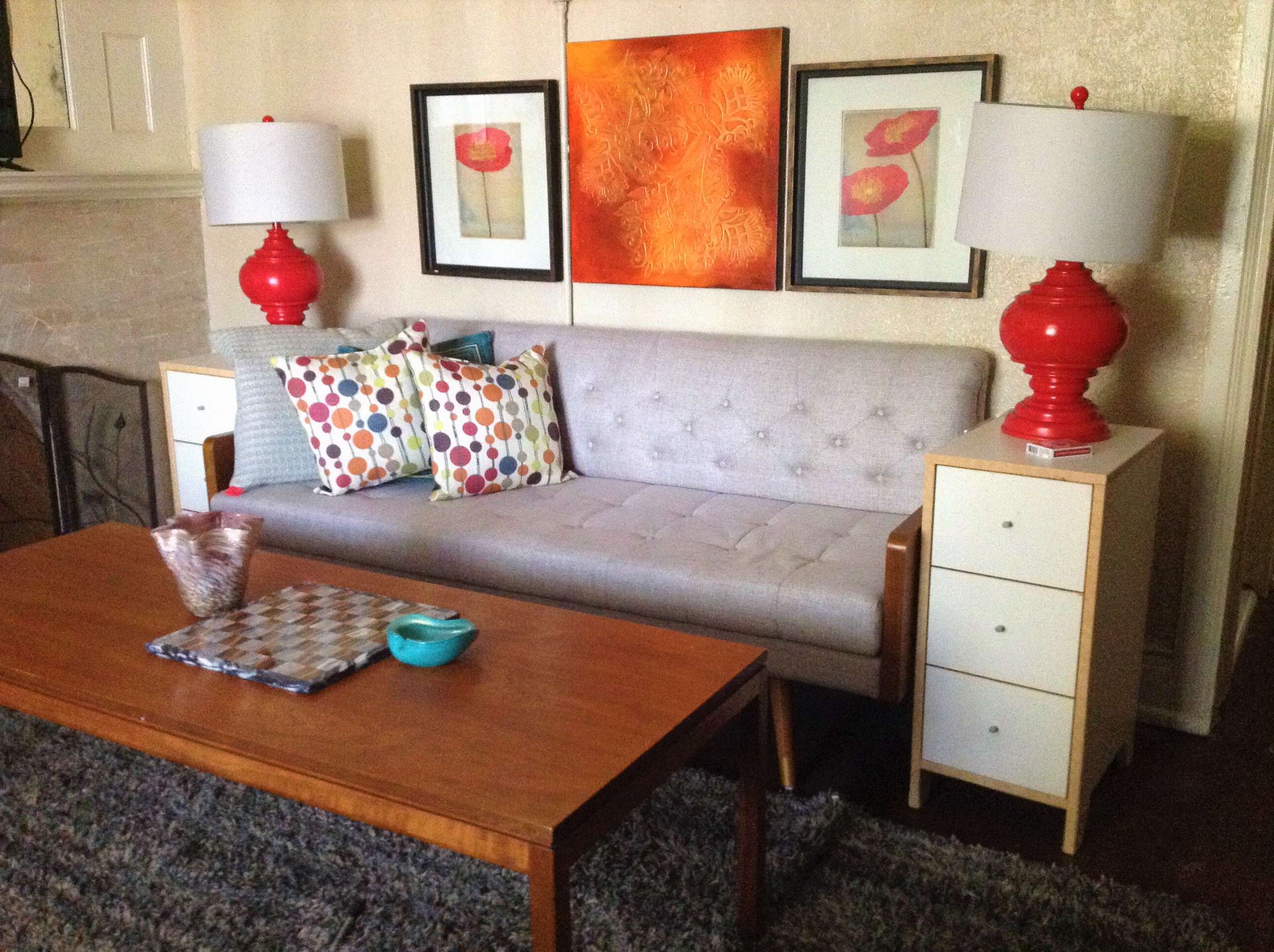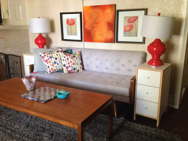 Long Grey Mid Century Modern Couch, and Separate Futon Bed Flat Screen TV nice Kitchenette LoadedSimple nice straight to the point for International National Tourist. Shower European Spa Flow Highly Satisfying for Visitors.